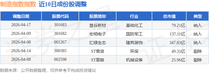 近10日内制造指数(399233)成份股做了调整,新纳入了3只股票,剔除了2只股票。