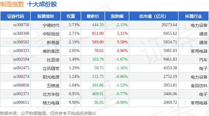制造指数(399233)十大成份股详情如下: