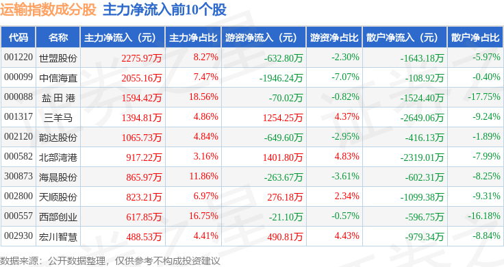 资金流向方面,运输指数(399237)成份股当日主力资金净流出合计1.91亿元,游资资金净流入合计8049.5万元,散户资金净流入合计1.1亿元。成份股资金流向详情见下表: