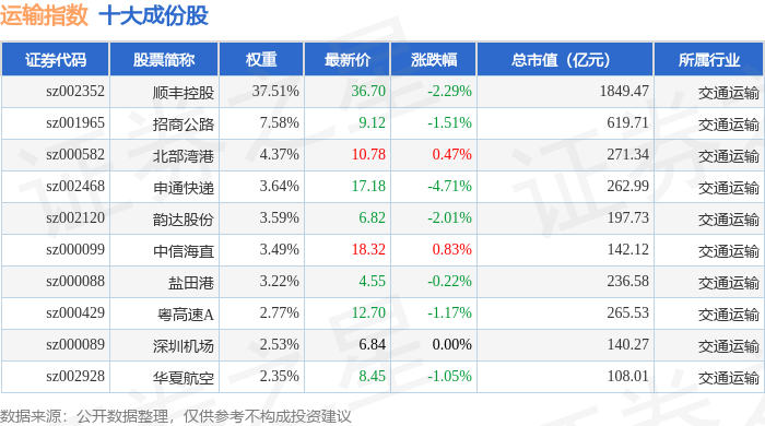 运输指数(399237)十大成份股详情如下: