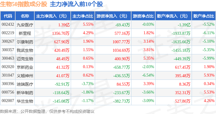 资金流向方面,生物50(399280)指数成份股当日主力资金净流出合计13.15亿元,游资资金净流入合计2.04亿元,散户资金净流入合计11.12亿元。成份股资金流向详情见下表: