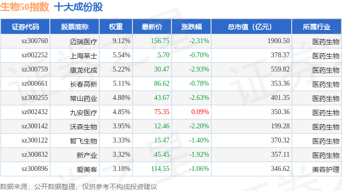 生物50(399280)指数十大成份股详情如下: