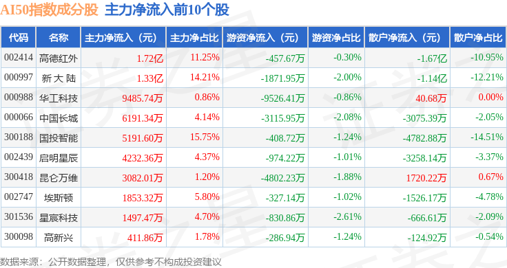 资金流向方面,AI50(399284)指数成份股当日主力资金净流出合计18.9亿元,游资资金净流入合计5618.66万元,散户资金净流入合计18.34亿元。成份股资金流向详情见下表: