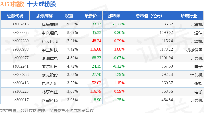 AI50(399284)指数十大成份股详情如下: