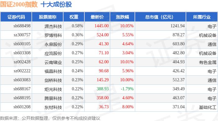 国证2000(399303)指数十大成份股详情如下: