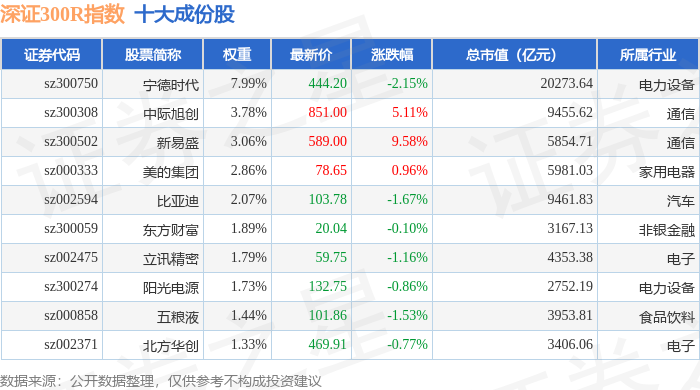 深证300R(399344)指数十大成份股详情如下: