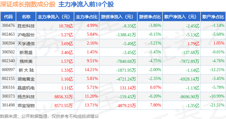 资金流向方面,深证成长(399346)指数成份股当日主力资金净流出合计97.81亿元,游资资金净流入合计38.54亿元,散户资金净流入合计59.27亿元。成份股资金流向详情见下表: