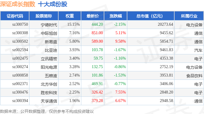 深证成长(399346)指数十大成份股详情如下: