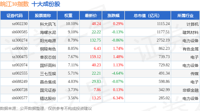 皖江30(399350)指数十大成份股详情如下: