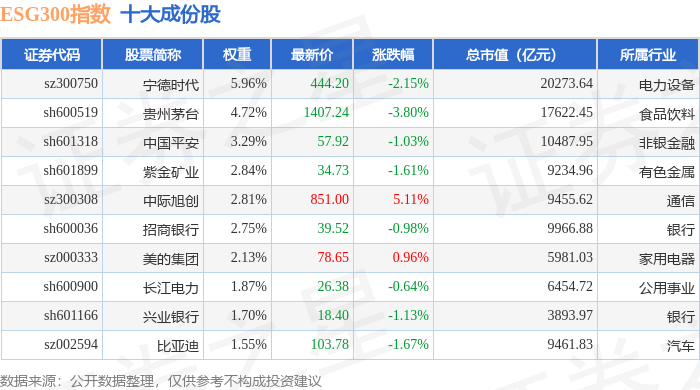 ESG300(399378)指数十大成份股详情如下: