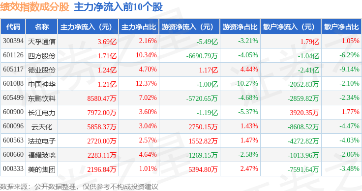 资金流向方面,绩效指数(399398)成份股当日主力资金净流出合计37.05亿元,游资资金净流入合计15.35亿元,散户资金净流入合计21.7亿元。成份股资金流向详情见下表: