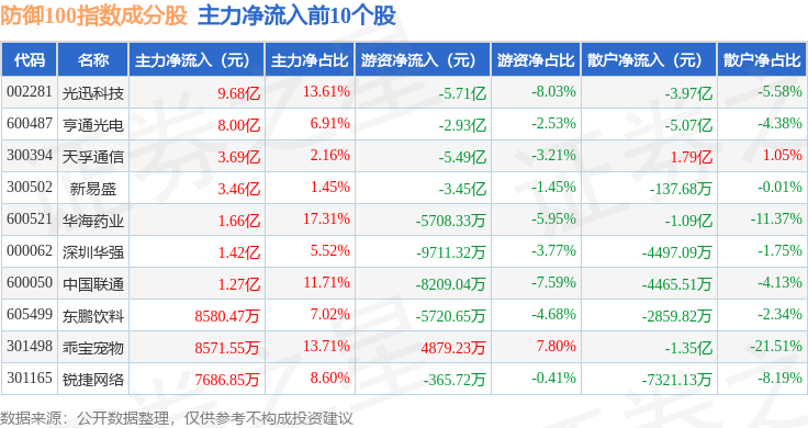 资金流向方面,防御100(399403)指数成份股当日主力资金净流出合计19.98亿元,游资资金净流入合计3.59亿元,散户资金净流入合计16.7亿元。成份股资金流向详情见下表:
