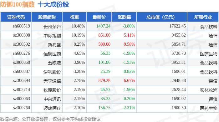 证券之星消息,4月17日,防御100(399403)指数报收于940366.0点,涨94.0%,成交1738.76亿元,换手率125.0%。当日该指数成份股中,上涨的有26家,光迅科技以10.0%的涨幅领涨,下跌的有73家,贵州茅台以3.8%的跌幅领跌。
