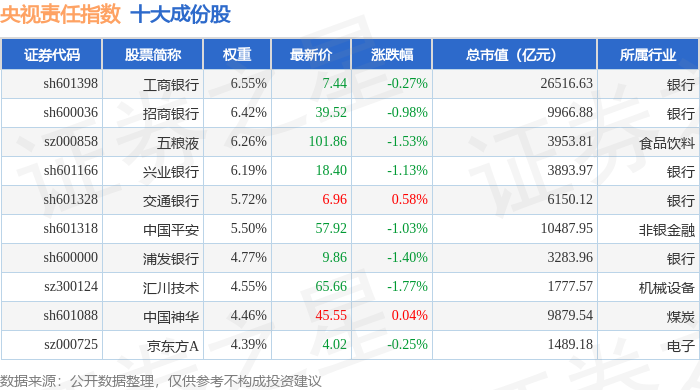 证券之星消息,4月17日,央视责任(399555)指数报收于512636.0点,跌77.0%,成交430.14亿元,换手率42.0%。当日该指数成份股中,上涨的有7家,环旭电子以5.88%的涨幅领涨,下跌的有41家,中集集团以3.8%的跌幅领跌。