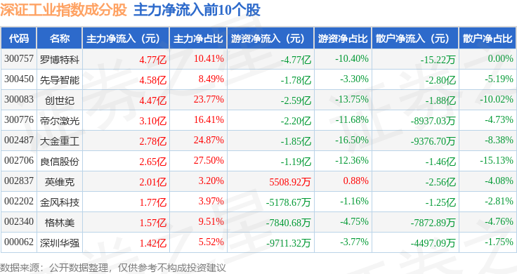 资金流向方面,深证工业(399615)指数成份股当日主力资金净流出合计61.09亿元,游资资金净流入合计17.49亿元,散户资金净流入合计43.6亿元。成份股资金流向详情见下表: