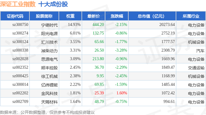 深证工业(399615)指数十大成份股详情如下: