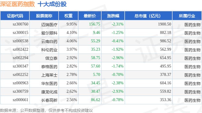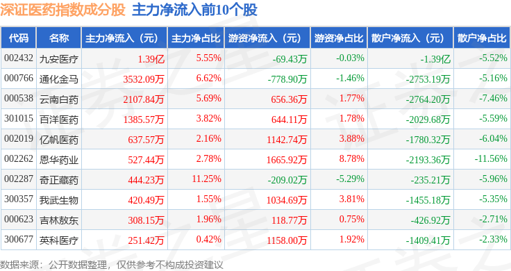 资金流向方面,深证医药(399618)指数成份股当日主力资金净流出合计18.89亿元,游资资金净流入合计2.79亿元,散户资金净流入合计16.1亿元。成份股资金流向详情见下表: