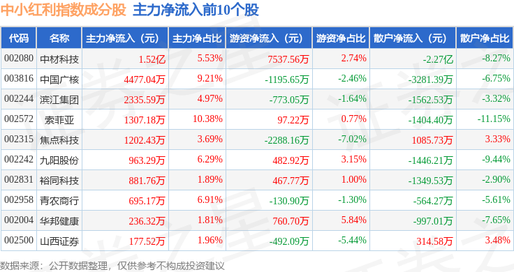 资金流向方面,中小红利(399649)指数成份股当日主力资金净流出合计16.75亿元,游资资金净流入合计5.9亿元,散户资金净流入合计10.85亿元。成份股资金流向详情见下表: