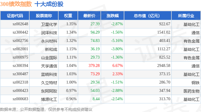 300绩效(399657)指数十大成份股详情如下: