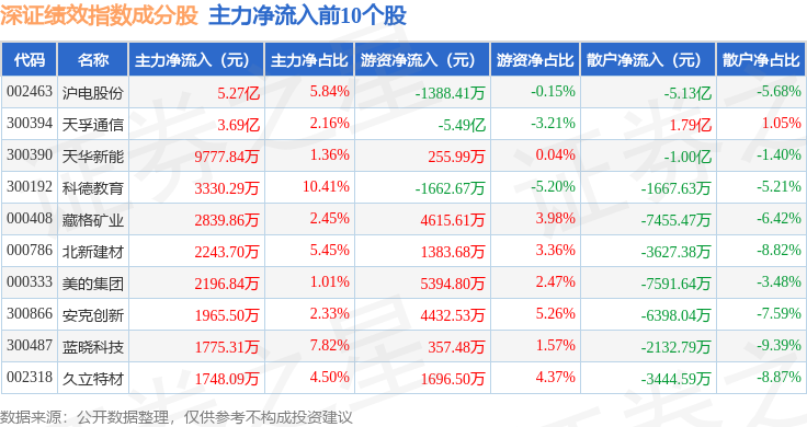 资金流向方面,深证绩效(399655)指数成份股当日主力资金净流出合计35.82亿元,游资资金净流入合计19.02亿元,散户资金净流入合计16.8亿元。成份股资金流向详情见下表: