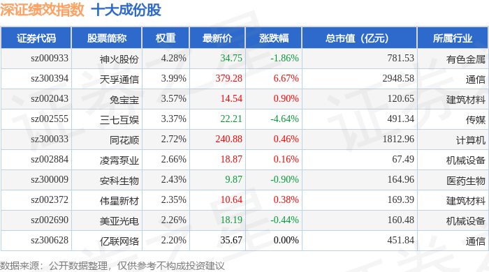 证券之星消息,4月17日,深证绩效(399655)指数报收于1106650.0点,跌42.0%,成交985.54亿元,换手率123.0%。当日该指数成份股中,上涨的有23家,天孚通信以6.67%的涨幅领涨,下跌的有76家,永兴材料以5.16%的跌幅领跌。