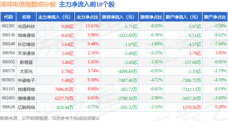资金流向方面,深成电信(399688)指数成份股当日主力资金净流入合计32.58亿元,游资资金净流出合计16.18亿元,散户资金净流出合计16.39亿元。成份股资金流向详情见下表: