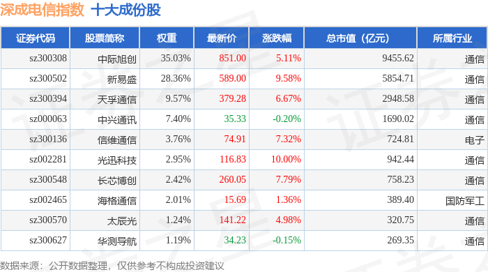 证券之星消息,4月17日,深成电信(399688)指数报收于910663.0点,涨614.0%,成交1086.35亿元,换手率348.0%。当日该指数成份股中,上涨的有13家,中瓷电子以10.0%的涨幅领涨,下跌的有2家,中兴通讯以0.2%的跌幅领跌。