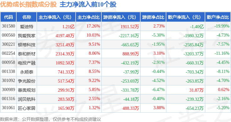资金流向方面,优势成长(399698)指数成份股当日主力资金净流出合计1.0亿元,游资资金净流入合计7450.55万元,散户资金净流入合计2552.29万元。成份股资金流向详情见下表: