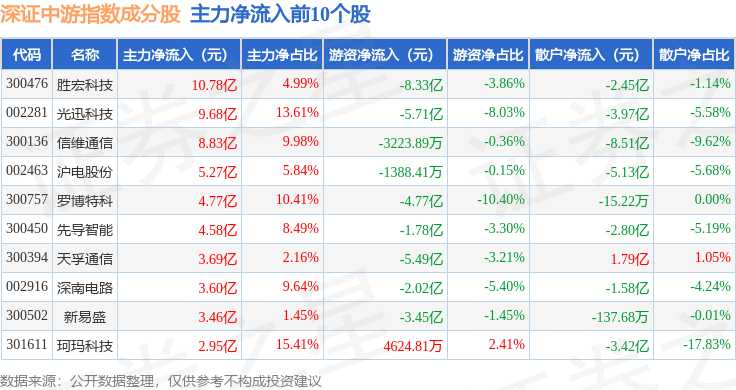 资金流向方面,深证中游(399705)指数成份股当日主力资金净流出合计30.92亿元,游资资金净流入合计17.76亿元,散户资金净流入合计13.16亿元。成份股资金流向详情见下表: