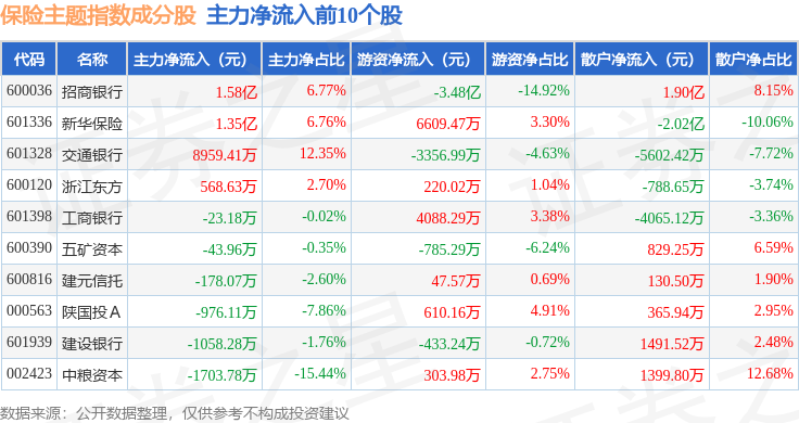 资金流向方面,保险主题(399809)指数成份股当日主力资金净流出合计8.04亿元,游资资金净流入合计9035.4万元,散户资金净流入合计7.13亿元。成份股资金流向详情见下表: