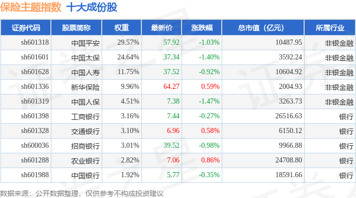 保险主题(399809)指数十大成份股详情如下: