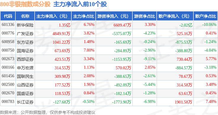 资金流向方面,800非银(399966)指数成份股当日主力资金净流出合计17.12亿元,游资资金净流入合计2.34亿元,散户资金净流入合计14.78亿元。成份股资金流向详情见下表: