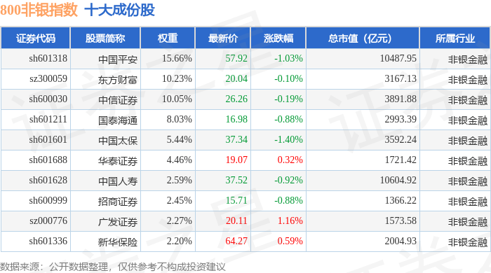 800非银(399966)指数十大成份股详情如下: