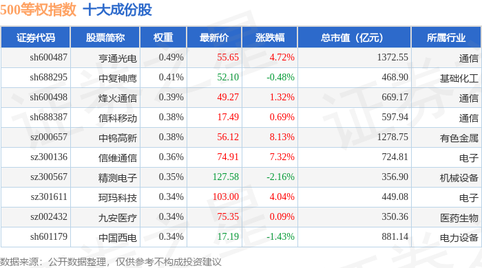 500等权(399982)指数十大成份股详情如下: