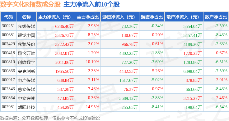 资金流向方面,数字文化R(470047)指数成份股当日主力资金净流出合计12.17亿元,游资资金净流入合计3.71亿元,散户资金净流入合计8.45亿元。成份股资金流向详情见下表: