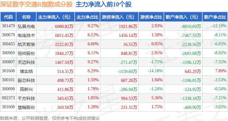 资金流向方面,深证数字交通R(470049)指数成份股当日主力资金净流出合计9.57亿元,游资资金净流入合计3.21亿元,散户资金净流入合计6.36亿元。成份股资金流向详情见下表: