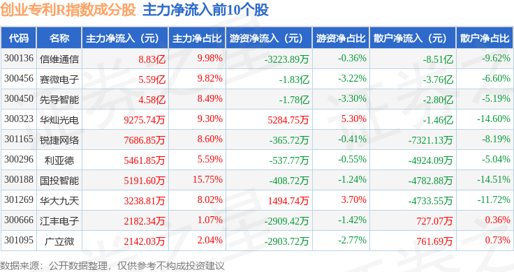 资金流向方面,创业专利R(470068)指数成份股当日主力资金净流出合计31.47亿元,游资资金净流入合计21.98亿元,散户资金净流入合计9.49亿元。成份股资金流向详情见下表: