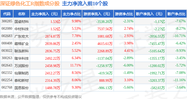 资金流向方面,深证绿色化工R(470076)指数成份股当日主力资金净流出合计35.36亿元,游资资金净流入合计22.99亿元,散户资金净流入合计12.37亿元。成份股资金流向详情见下表: