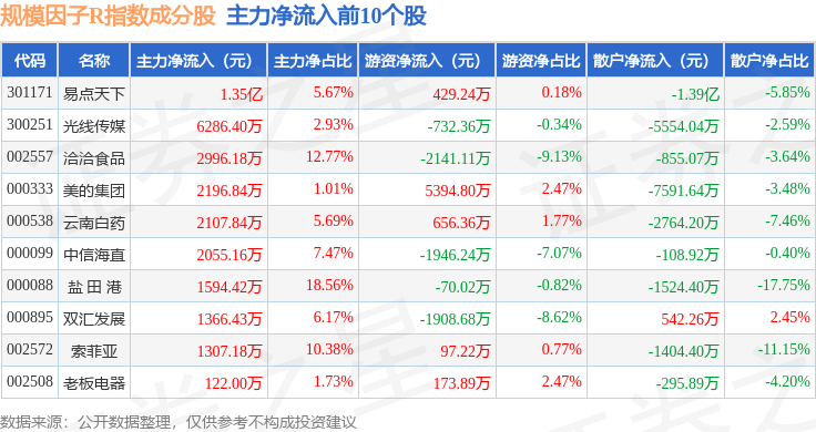 资金流向方面,规模因子R(480055)指数成份股当日主力资金净流出合计15.82亿元,游资资金净流入合计7.39亿元,散户资金净流入合计8.43亿元。成份股资金流向详情见下表: