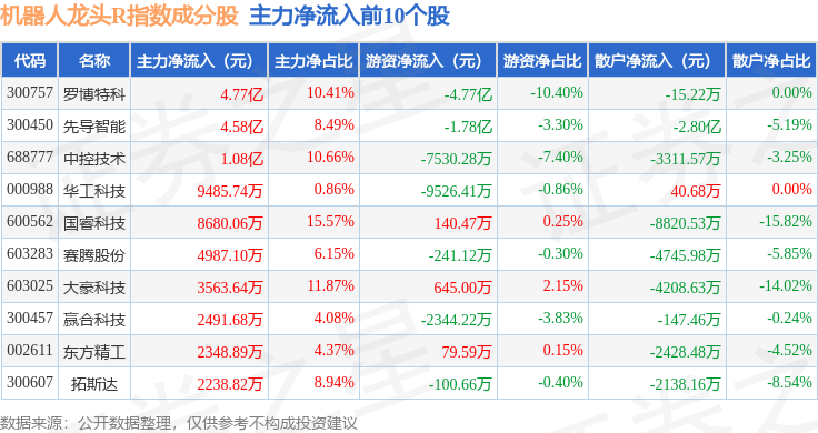 资金流向方面,机器人龙头R(480071)指数成份股当日主力资金净流入合计8288.14万元,游资资金净流出合计5.72亿元,散户资金净流入合计4.89亿元。成份股资金流向详情见下表:
