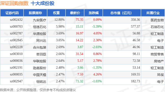 深证回购(970063)指数十大成份股详情如下:
