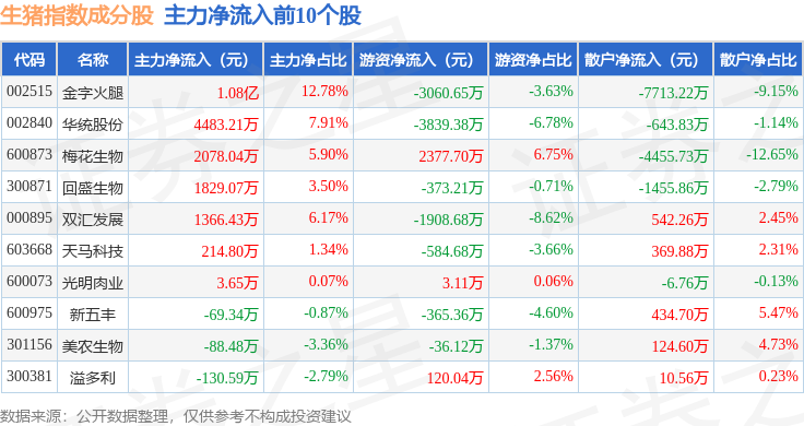 资金流向方面,生猪指数(980073)成份股当日主力资金净流出合计8.18亿元,游资资金净流入合计1947.49万元,散户资金净流入合计7.99亿元。成份股资金流向详情见下表: