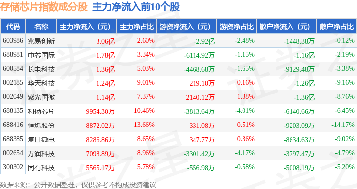 资金流向方面,存储芯片(980138)指数成份股当日主力资金净流出合计43.26亿元,游资资金净流入合计38.47亿元,散户资金净流入合计4.79亿元。成份股资金流向详情见下表: