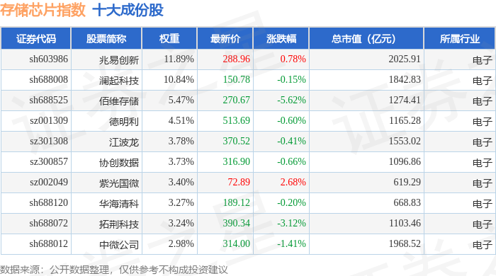证券之星消息,4月17日,存储芯片(980138)指数报收于222857.0点,跌27.0%,成交1105.9亿元,换手率412.0%。当日该指数成份股中,上涨的有20家,恒烁股份以6.41%的涨幅领涨,下跌的有21家,佰维存储以5.62%的跌幅领跌。