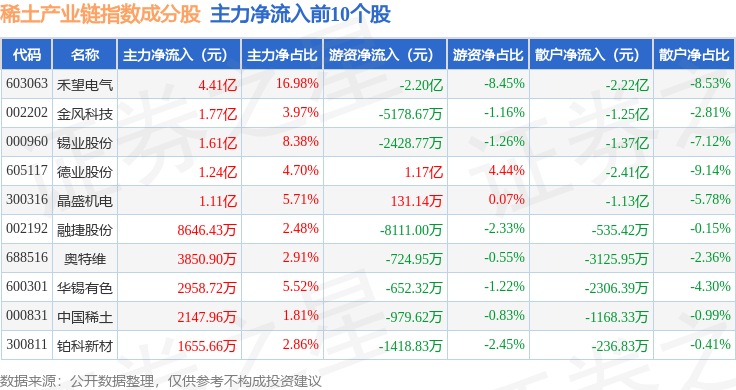 资金流向方面,稀土产业链(989013)指数成份股当日主力资金净流出合计61.74亿元,游资资金净流入合计34.28亿元,散户资金净流入合计27.46亿元。成份股资金流向详情见下表: