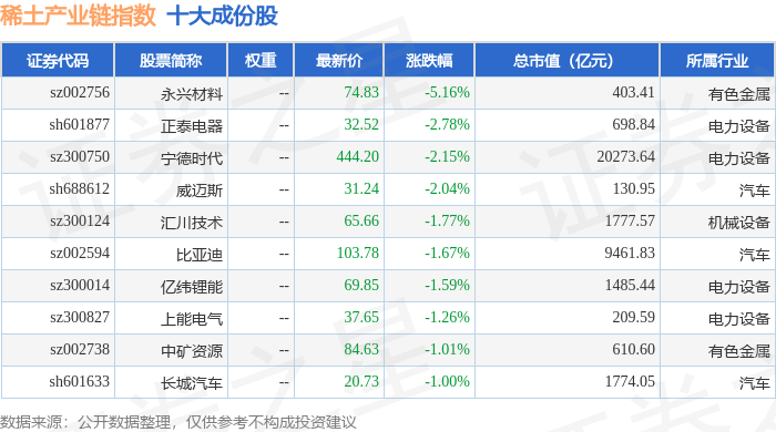 证券之星消息,4月17日,稀土产业链(989013)指数报收于402904.0点,跌54.0%,成交1047.67亿元,换手率256.0%。当日该指数成份股中,上涨的有29家,禾望电气以9.99%的涨幅领涨,下跌的有20家,永兴材料以5.16%的跌幅领跌。