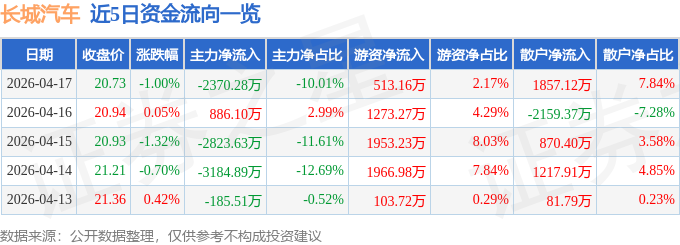 证券之星消息,截至2026年4月17日收盘,长城汽车(601633)报收于20.73元,下跌1.0%,换手率0.18%,成交量11.44万手,成交额2.37亿元。