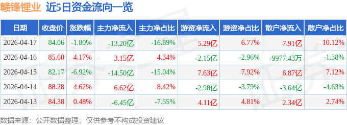 证券之星消息,截至2026年4月17日收盘,赣锋锂业(002460)报收于84.06元,下跌1.8%,换手率7.6%,成交量92.08万手,成交额78.16亿元。