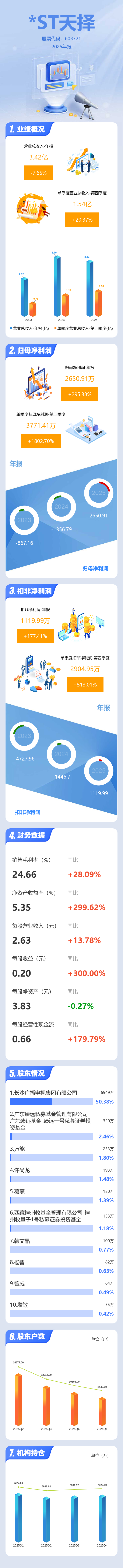 证券之星消息,*ST天择2025年年报显示,当年度公司主营收入3.42亿元,同比下降7.65%;归母净利润2650.91万元,同比上升295.38%;扣非净利润1119.99万元,同比上升177.42%;其中2025年第四季度,公司单季度主营收入1.54亿元,同比上升20.37%;单季度归母净利润3771.41万元,同比上升1802.71%;单季度扣非净利润2904.95万元,同比上升513.02%;负债率40.6%,投资收益830.92万元,财务费用-88.89万元,毛利率24.66%。