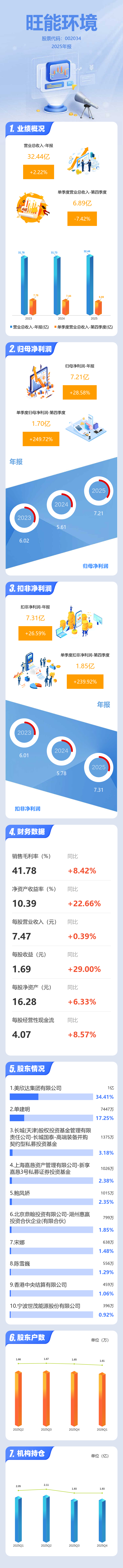 证券之星消息,旺能环境2025年年报显示,当年度公司主营收入32.44亿元,同比上升2.23%;归母净利润7.21亿元,同比上升28.58%;扣非净利润7.31亿元,同比上升26.6%;其中2025年第四季度,公司单季度主营收入6.89亿元,同比下降7.43%;单季度归母净利润1.7亿元,同比上升249.73%;单季度扣非净利润1.85亿元,同比上升239.93%;负债率47.55%,投资收益-88.81万元,财务费用1.99亿元,毛利率41.78%。